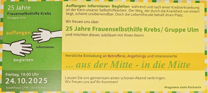 Die Frauenselbsthilfe Krebs / Gruppe Ulm feiert 25-jähriges Bestehen und alle sind herzlich eingeladen! Der Eintritt ist frei!